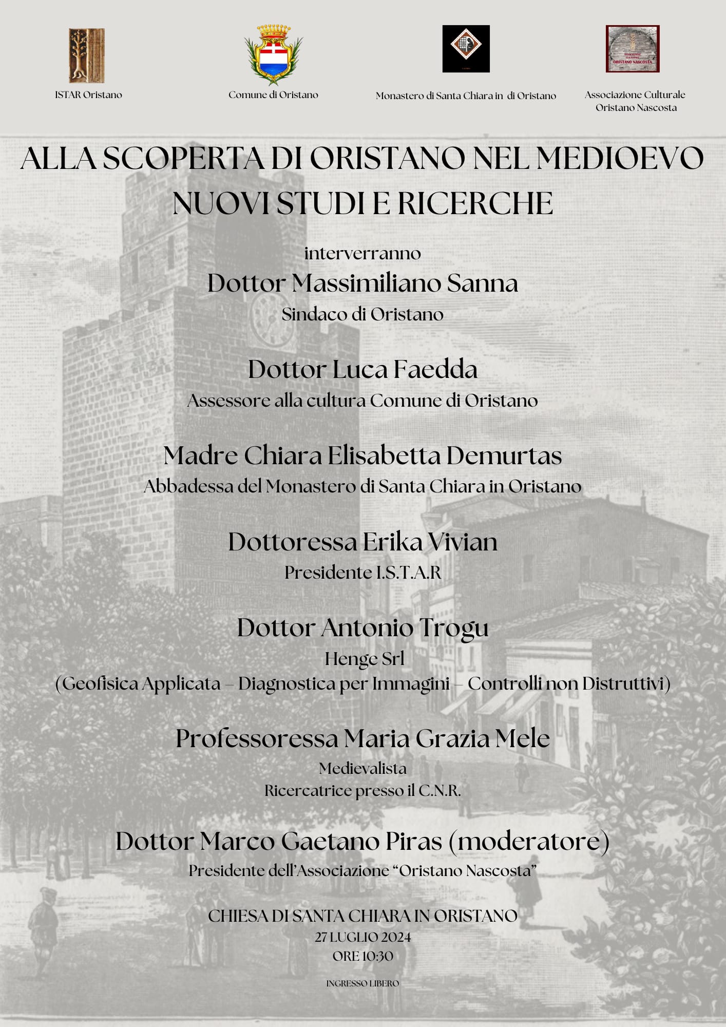 In su seminàriu, apustis de is saludus de su Sìndigu, de s'Assessori a sa Cultura de su Comuni de Aristanis e a s'abbadissa de su Munistei de Santa Crara, at a pigai su fueddu Erika Vivian (Presidenti ISTAR), Antonio Trogu (Henge srl), Maria Grazia Mele (mediovalista e circadora in su CNR) mentras at a fai su moderadori Marco Gaetano Piras (presidenti de s'Assòtziu “Oristano nascosta”).