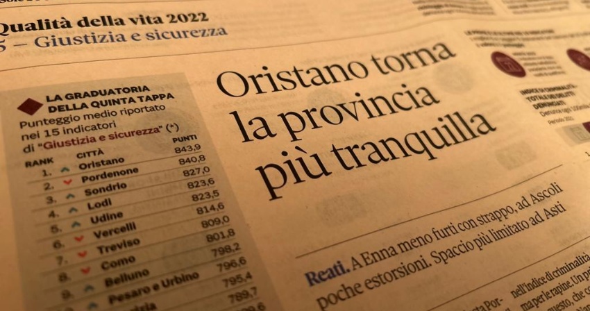 Sa fotografia de su Sole 24 Ore cunfirmat s’etzellèntzia de Aristanis e de sa provìntzia in contu de giustìtzia, seguresa e òrdine pùblicu. Su resurtadu benit dae s’elaboratzione de sos datos de su Dipartimentu de Seguresa Pùblica (Ministeru de s’Internu) e dae s’Istat chi signalat Casteddu a su de 44 postos, Tàtari in su de 29 e Nùgoro in su de 36.