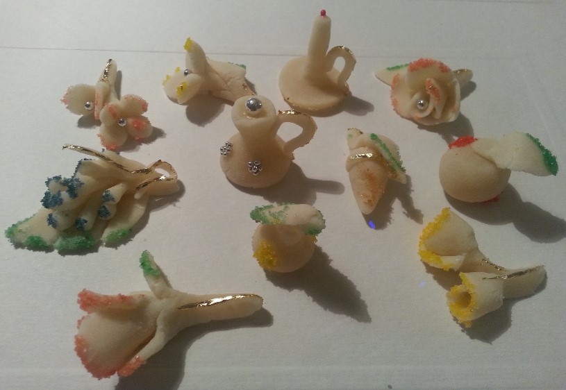Sos candelaos sunt durches de mèndula, cun formas vàrias: columbas, frores, fruta, tzoculitas, canes, brochitas e àteras ancora. Sa mèndula mòlida a fine a fine si coghet unu pagu in su tzùcaru cotu e pro unas cantas dies si càriat fintzas chi est lisa lisa e bella pro fàghere sas formas chi, a pustis chi ant assutadu sentza ddas còghere in su forru, si decorant cun tzùcaru coloradu, tragea e oro.