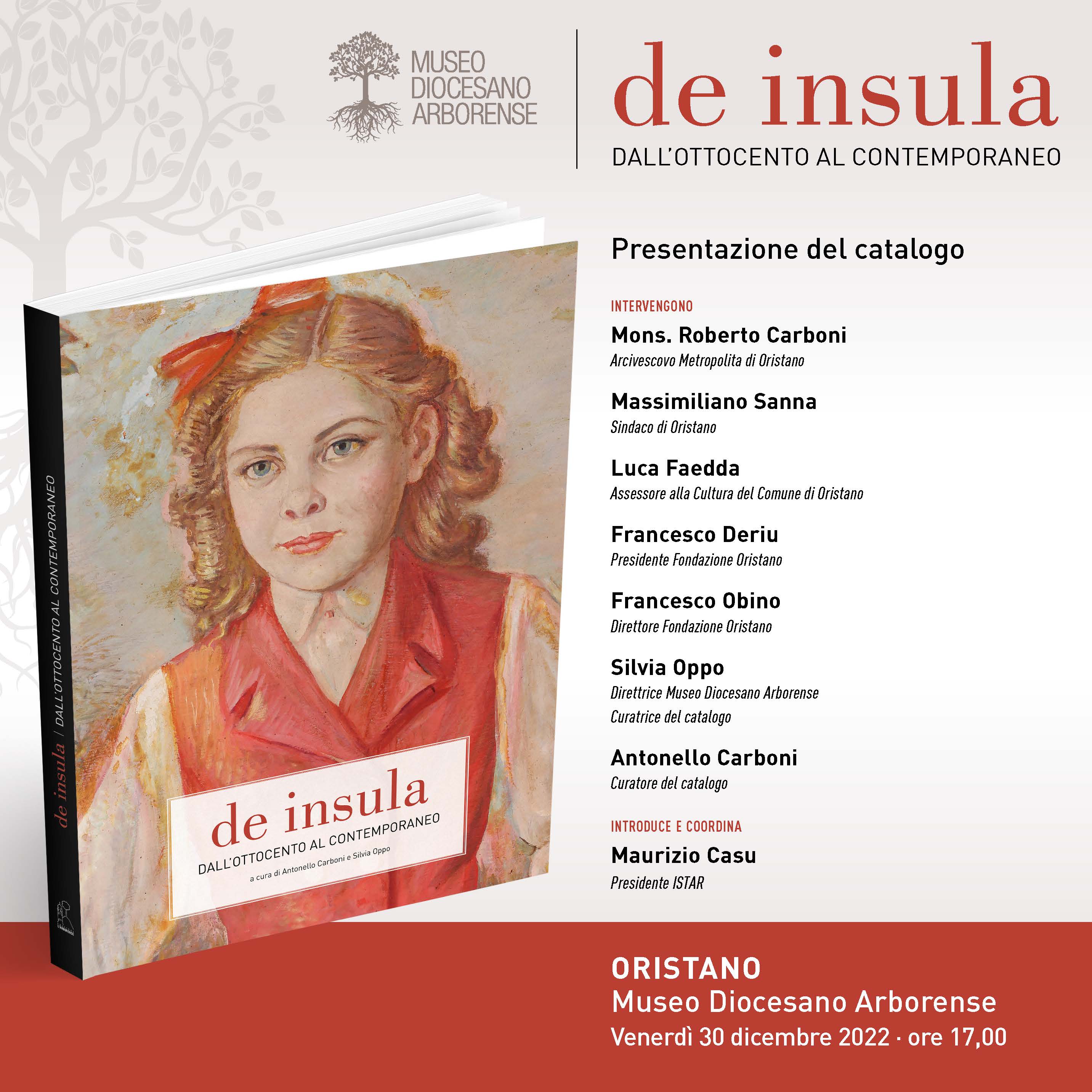 Su 30 de natale 2022, in Aristanis, in sa Sala San Pio X de su Museu Diotzesanu Arborense, in Pratza de sa Catedrale 1, a sas 05,00 de sero, s’at a presentare su catàlogu de sa mustra De Insula, dall’Ottocento al contemporaneo /dae s’Otighentos a su contemporàneu.