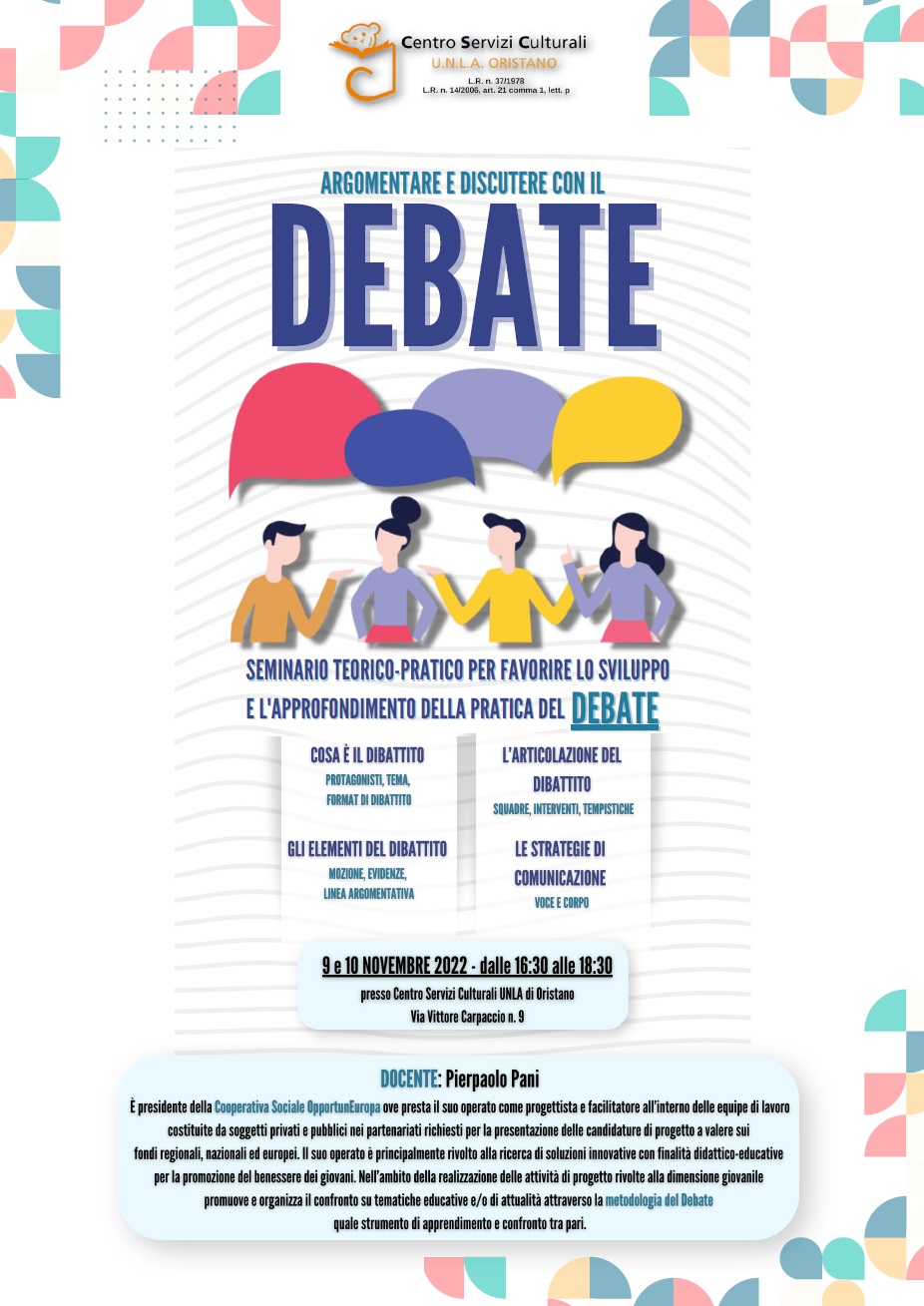 Su debate, disciplina iscolàstica isvilupada in sos paisos anglosàssones, tenet comente punna printzipale s’isvilupu de cumpetèntzias trasversales (life skills) chi pertocant s’àrea de sa comunicatzione e de sos limbàgios. Su debate est unu cunfrontu de duas iscuadras de istudiantes chi sustenent e contraputant un’afirmatzione o un’argumentu chi ddi est istadu dadu, impreende cumpetèntzias comunicativas, oratòrias e crìticas.