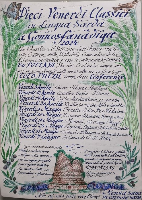 Cenàbura 5 de abrili a sa ora de is 6 de merii, in su ristoranti “su Pottabi” in Gonnos, Toto Putzu at a fai sa primu cunferèntzia in lìngua sarda de is dexi postas in contu de cenàbura, finas a su 7 de su mesi de làmpadas chi ant a tenni a tema is clàssicus de sa literadura, movendi de òperas de Omeru, e tochendi cussas de Boccaccio, Manzoni, Leopardi, Carducci finas a D'Annunzio. Mentras cenàbura 7 de làmpadas sa cunferèntzia at a essi dedicada a Gigi Riva, grandu òmini e giogadori de palloni, mortu de pagu.