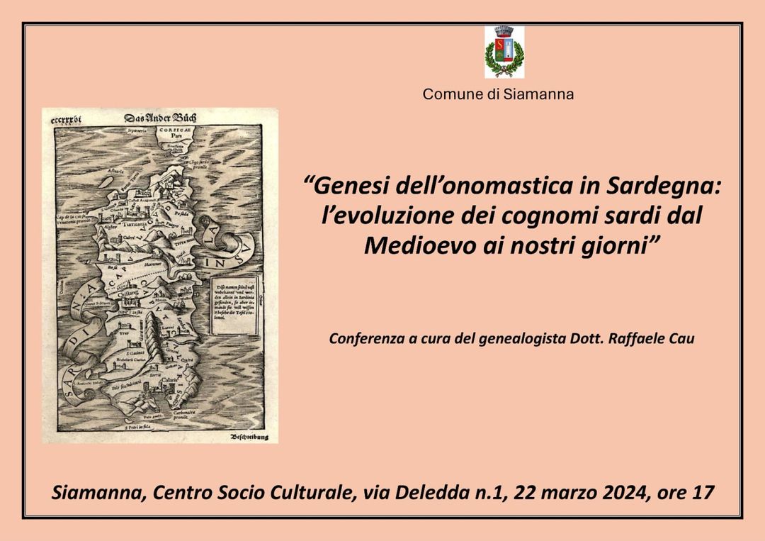 S’AMMINISTRATZIONI comunali de Siamanna cumbidat totu is tzitadinus a pigai parti a sa cunferèntzia a suba a “Sa nàscida de s’onomàstica in Sardigna: isvilupu de is sangunaus sardus a movi de s’Edadi de Mesu finas a dii de oi”.