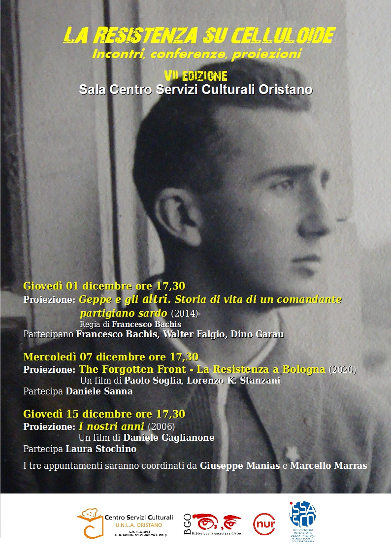 Mèrcuris 07 de nadale, a sas 05,30 de merie, in sa sala de su Tzentru Servìtzios Culturales UNLA de Aristanis, pro su de duos addòbios cun SA RESISTÈNTZIA IN TZELLULÒIDE - LA RESISTENZA SU CELLULOIDE (sa de VII EDITZIONES) at a èssere projetadu The Forgotten Front – La Resistenza a Bologna (2020), unu film de Paolo Soglia, Lorenzo K. Stanzani