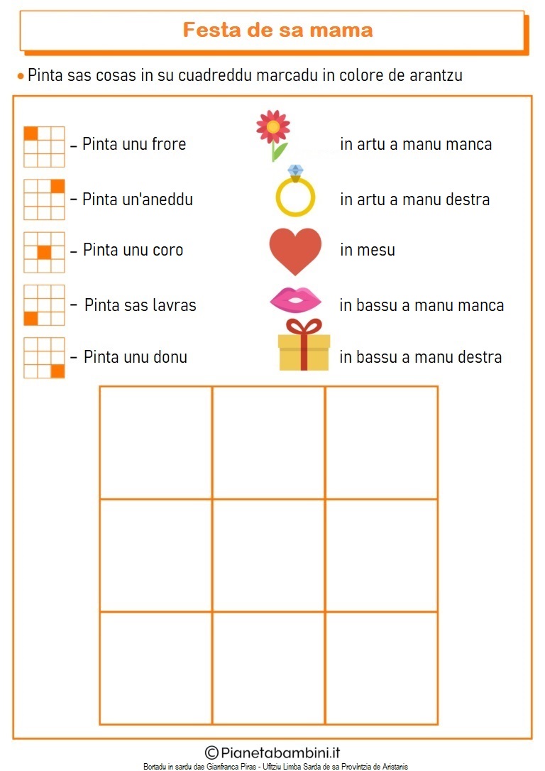 Una parte de custas ischedas sunt iscarrigadas dae sa pàgina https://pianetabambini.it/ chi cuntenet ischedas didàticas de tantas genias. Nois las amus bortadas in sardu, las podides iscarrigare dae su link chi sighit: https://ajoaiscola.blogspot.com/2022/05/ischedas-didaticas-pro-sa-festa-de-sa.html.