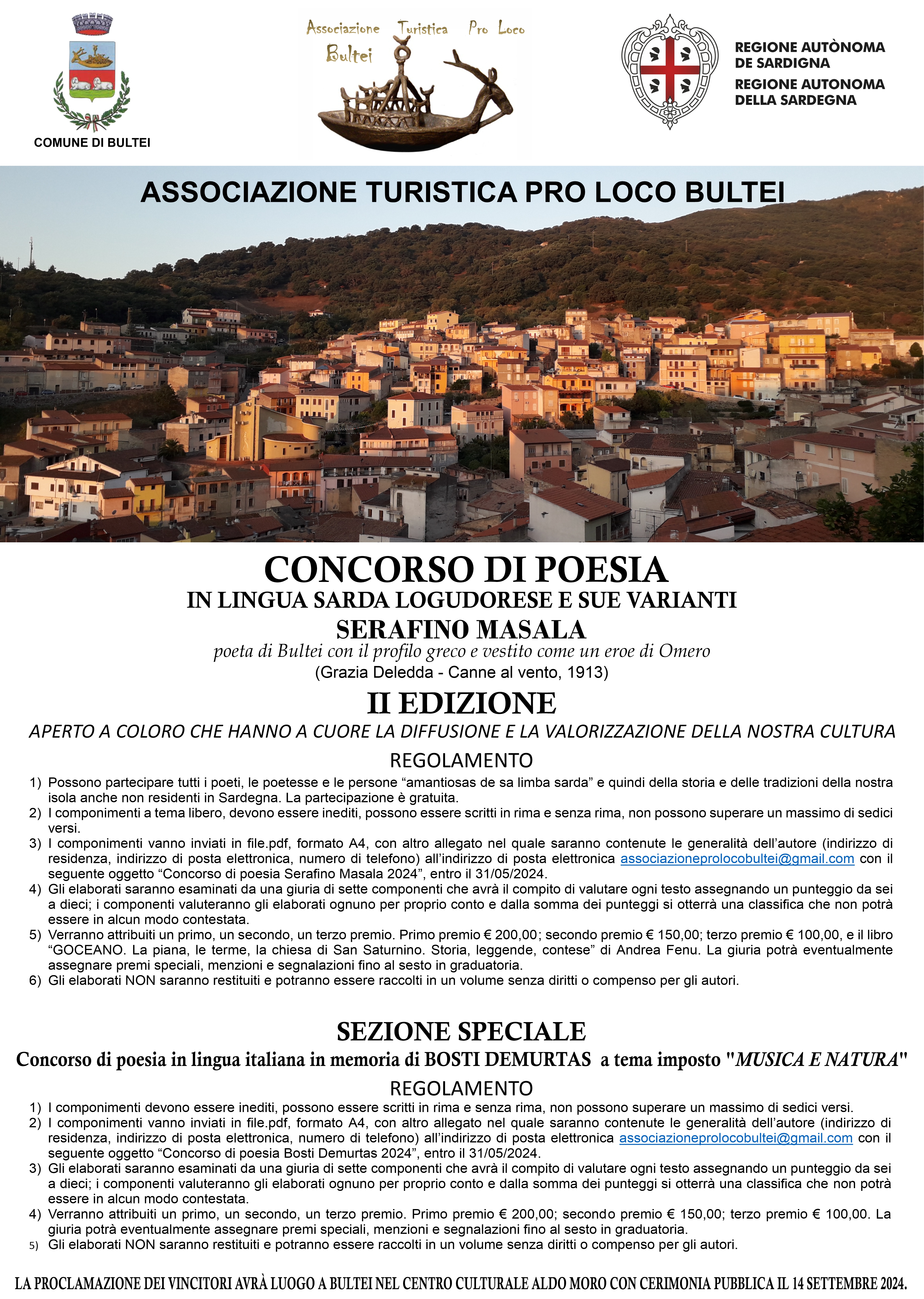 Is traballus tocat a ddus mandai intra a su 31 de maju; sa cerimònia de premiatzioni s’at a fai su 14 de cabudanni 2024 in su tzentru culturali Aldo Moro a Bultei.