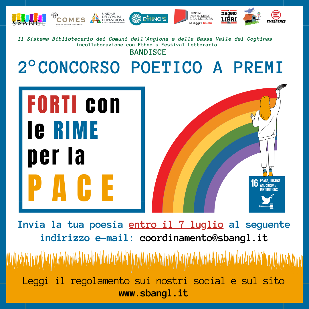 Su Sistema Bibliotecàriu de is Comunus de s'Anglona e de sa Badde Bassa de su Coghinas (SBANGL) , pighendi parti a su “Maggio dei libri 2024” a manu de pari cun Emergency Tàtari e is assòtzius e is Pro Loco de s'Anglona e cun su patrocìniu de Ethno's festival letterario, at bandiu sa segundu editzioni de “Forti con le rime” cuncursu poèticu asuba de su tema de sa paxi e sa giustìtzia.