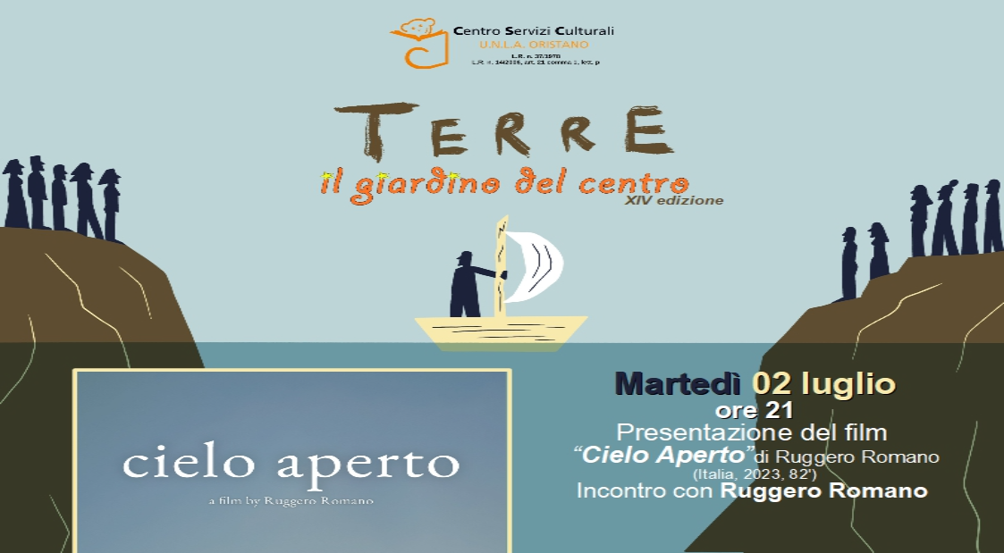 A is 9 oras de custu merii in su giardinu de su Tzentru Servìtzius Culturalis UNLA de Aristanis, in sa bia de Carpaccio 9, nci at a essi sa presentada de su film “Cielo aperto” (Italia, 2023, 82') de Ruggero Romano, regista e produtori italianu chi traballat intra de Vancouver e Venezia.