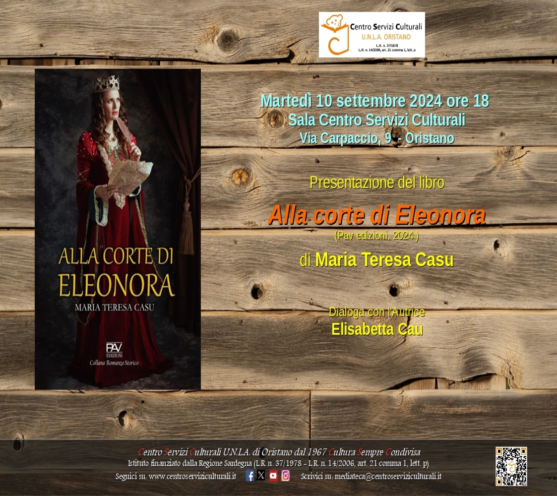 Martis, 10 de cabudanni a is 6 de merii in sa sala de su Tzentru Servìtzius Culturalis UNLA de Aristanis, in sa bia de Carpaccio, Maria Teresa Casu, maista de matemàtica in pensioni, at a presentai su lìburu suu “Alla corte di Eleonora d’Arborea”, Pav editzionis, 2024.