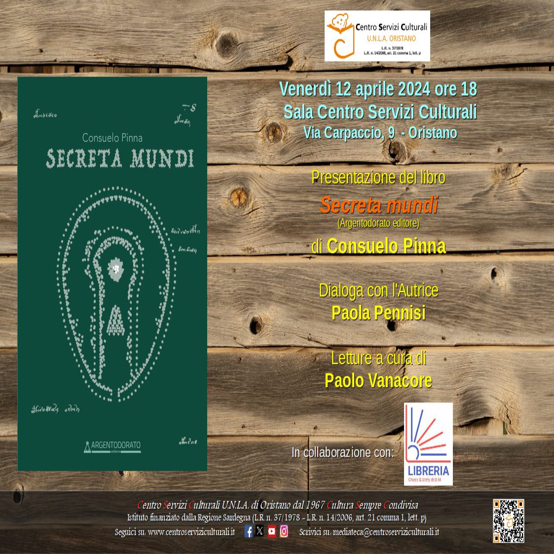 Su Centru Servìtzius Culturalis UNLA de Aristanis, partepari cun sa libreria “Chiara & Stefy” di B.M. de Bilartzi, ant cuncordau po cenàbura 12 de abrili de su 2024 a is 6 de merii, in sa sala de sa bia de Carpaccio, sa presentada de su lìburu “Secreta mundi” de Consuelo Pinna, Argentodorato editori.