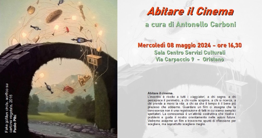 Cras, mèrcuris 8 de maju de su 2024 in su Tzentru Servìtzius Culturalis UNLA de Aristanis nci at a essi su seminàriu “Abitare il Cinema” a incuru de Antonello Carboni, registra documentarista.
