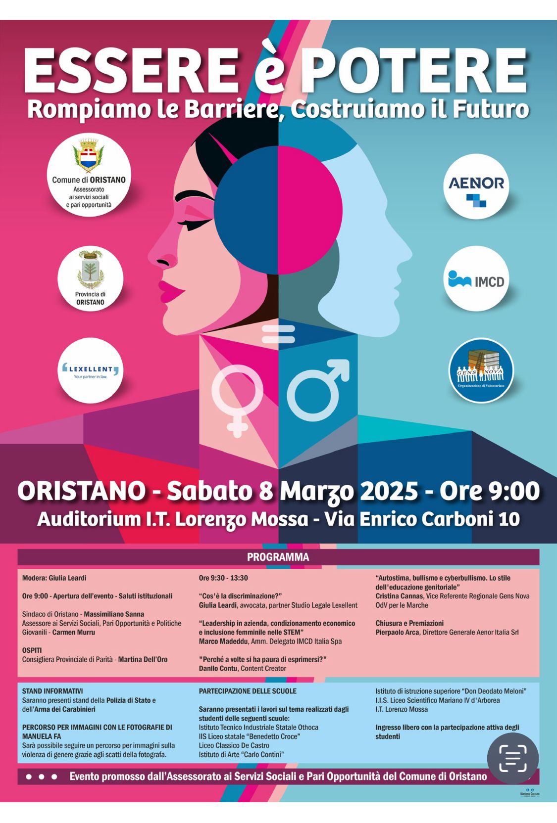 In occasione dell’8 marzo, presso l’Auditorium dell’I.T. Lorenzo Mossa di Oristano si parlerà con gli studenti delle scuole superiori di inclusione, rispetto e parità di genere e come questi temi debbano tradursi in azioni concrete.