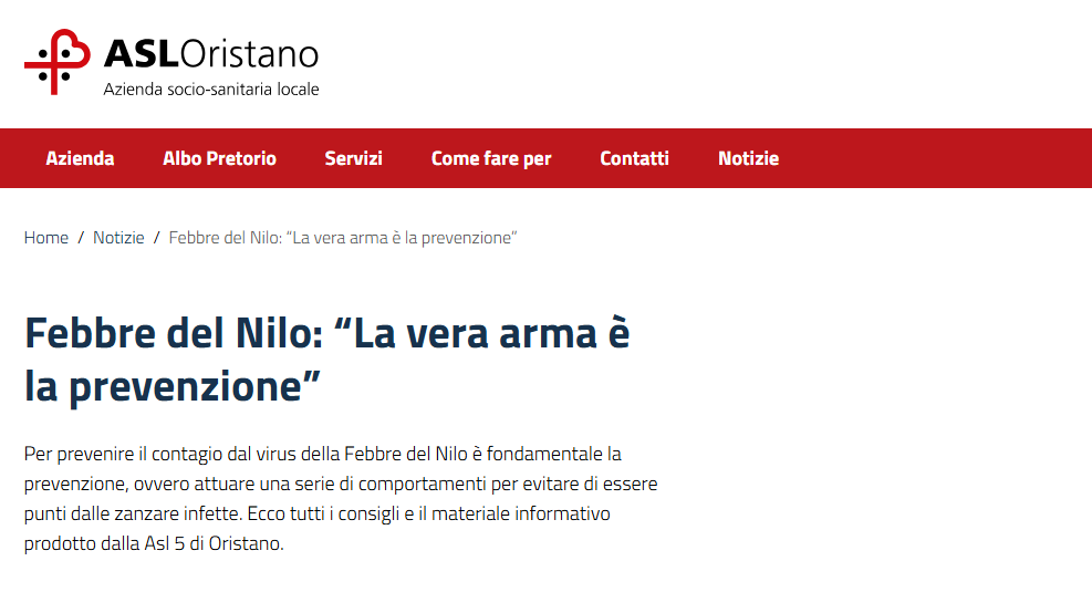 Febbre del Nilo: la vera arma è la prevenzione 05/08/2025 - La direzione generale della Asl 5 di Oristano e il Dipartimento di Igiene e Prevenzione ricordano che la vera arma per evitare di essere contagiati dal virus della West Nile è la prevenzione. Vai alla pagina dedicata: Febbre del Nilo: "La vera arma è la prevenzione" - ASL Oristano Invia Stampa Condividi su: Facebook Twitter Linkedin Google+